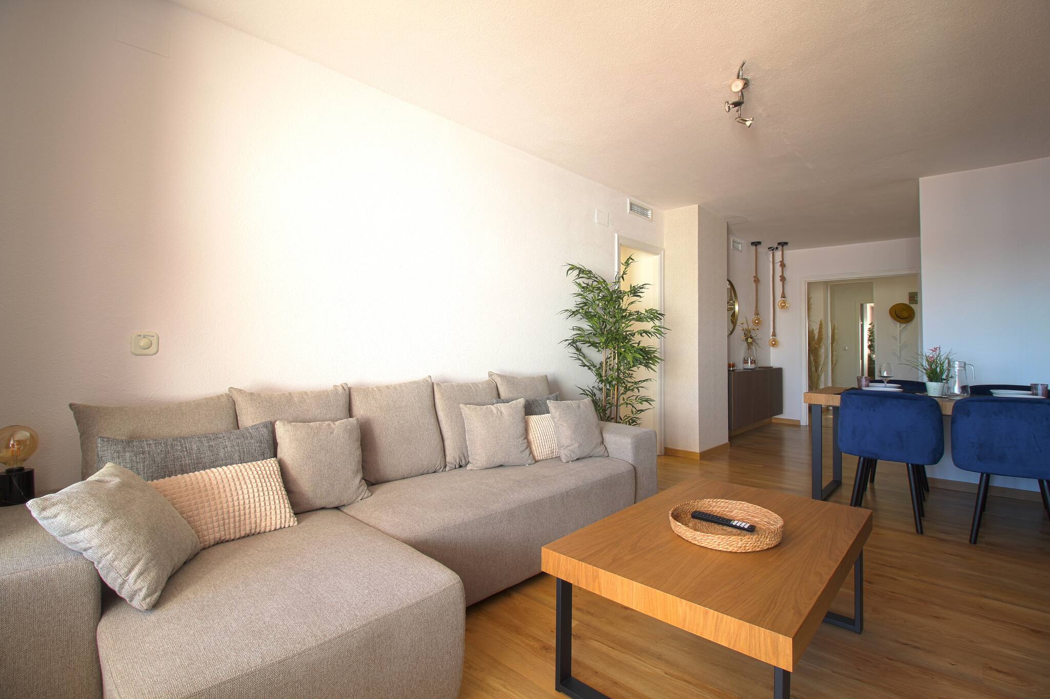 El salón-comedor y el dormitorio principal tienen unas impresionantes vistas sobre la playa de Los Locos y las puestas de sol. El otro dormitorio y el baño dan a un patio interior. La cocina esta abierta al salón-comedor.