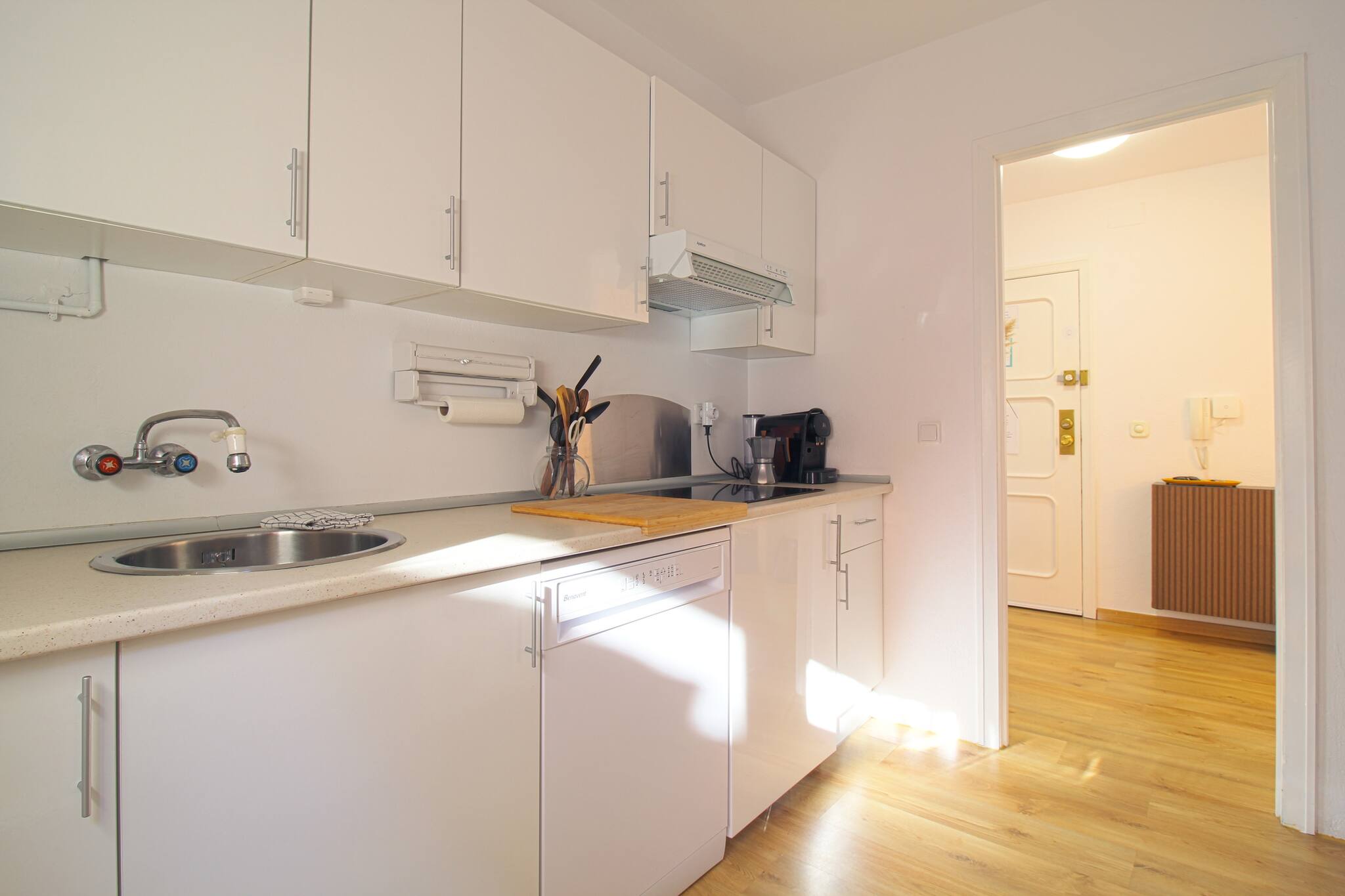 La cocina está equipada con microondas, nevera, lavavajillas, lavadora, tostadora y los utensilios de cocina necesarios. El apartamento está totalmente equipado y provisto de sábanas, toallas, plancha, secador de pelo y televisión.